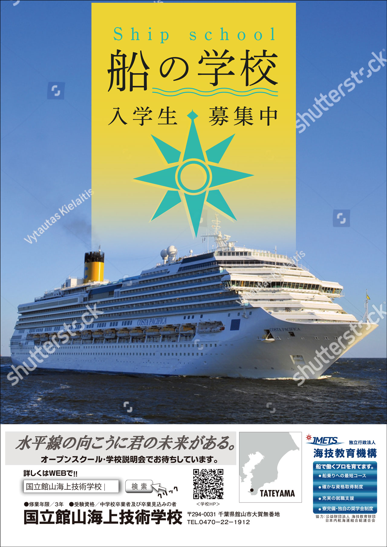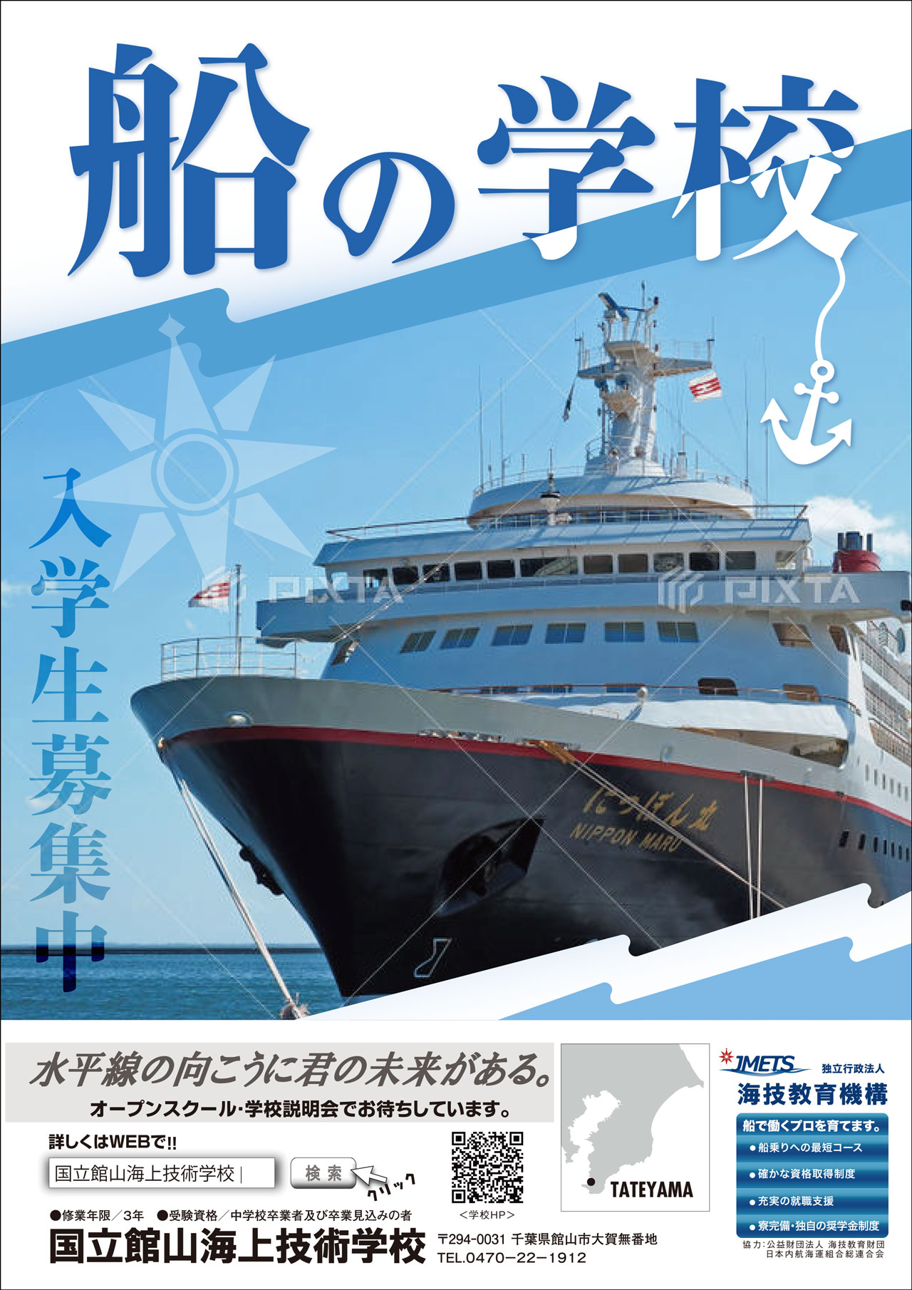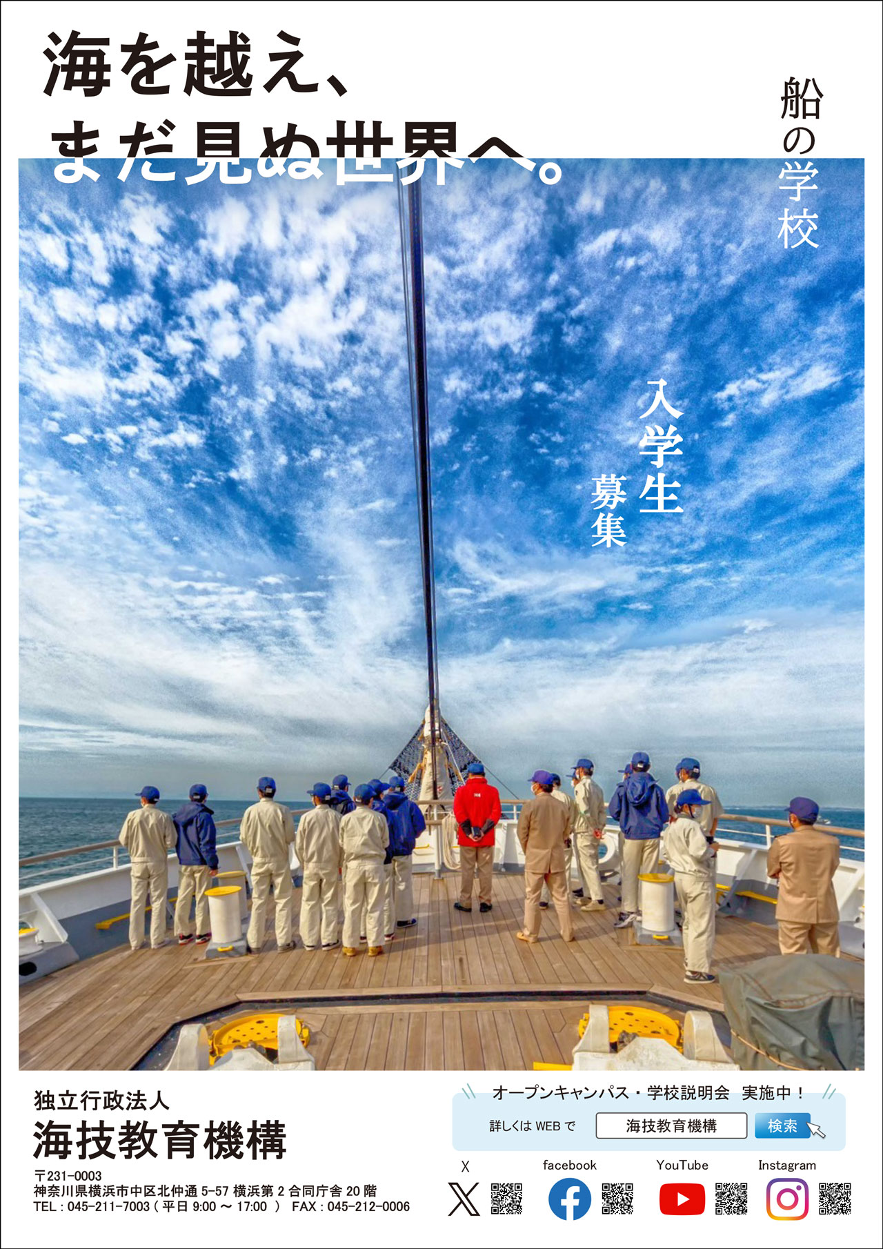 全面の写真では、若い人に人気の新海誠の作画をイメージし、爽やかな青空に少し派手な色彩を加えて動きを出しています。また、学生の写真(男女)を配置し、職業訓練校ではない、多くの仲間と出会う豊かな学校生活のイメージを伝えたいと考えました。